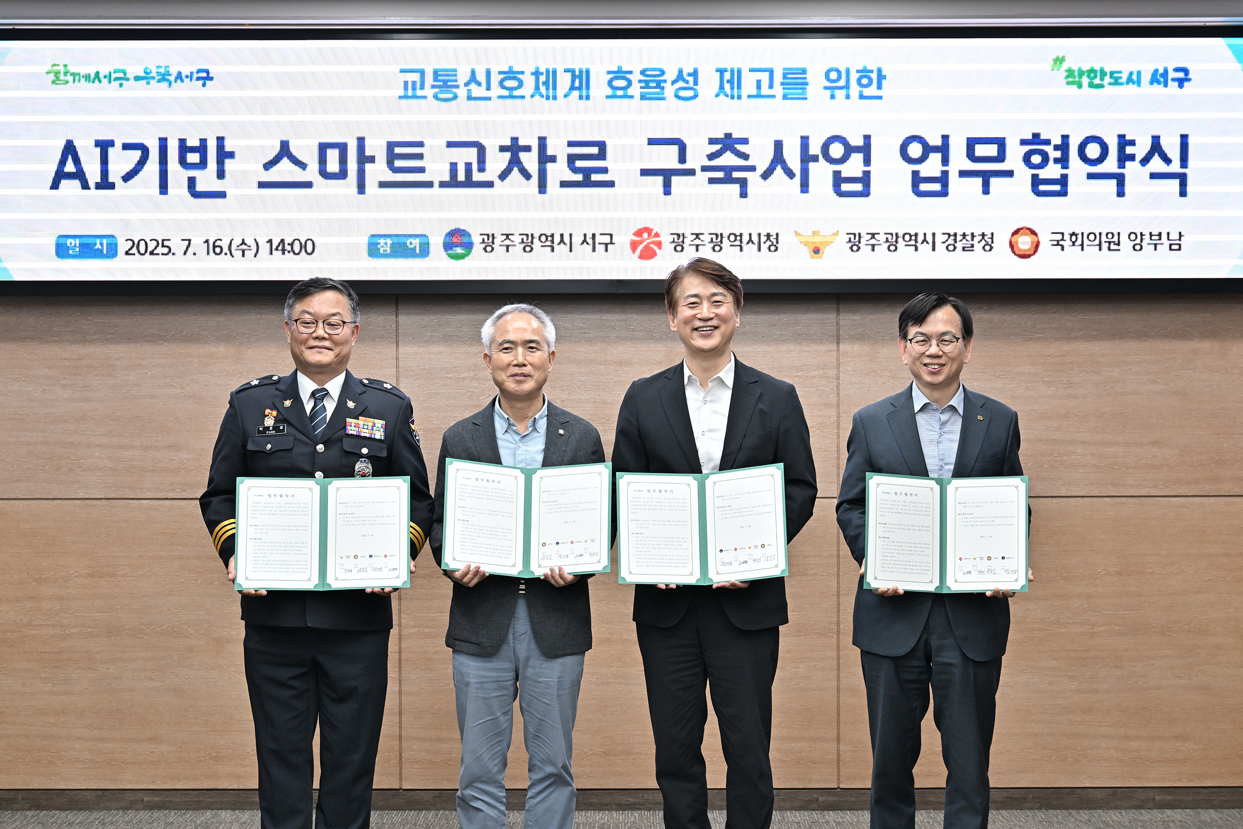 서구는 16일 서구청 나눔홀에서 광주광역시, 광주경찰청과 함께 ‘AI 기반 스마트교차로 구축사업’을 위한 업무협약을 체결했다. 협약식에는 김이강 서구청장을 비롯해 양부남 국회의원, 고광완 광주시 행정부시장, 박준성 광주경찰청 생활안전부장 등 각 기관 관계자들이 참석했다.